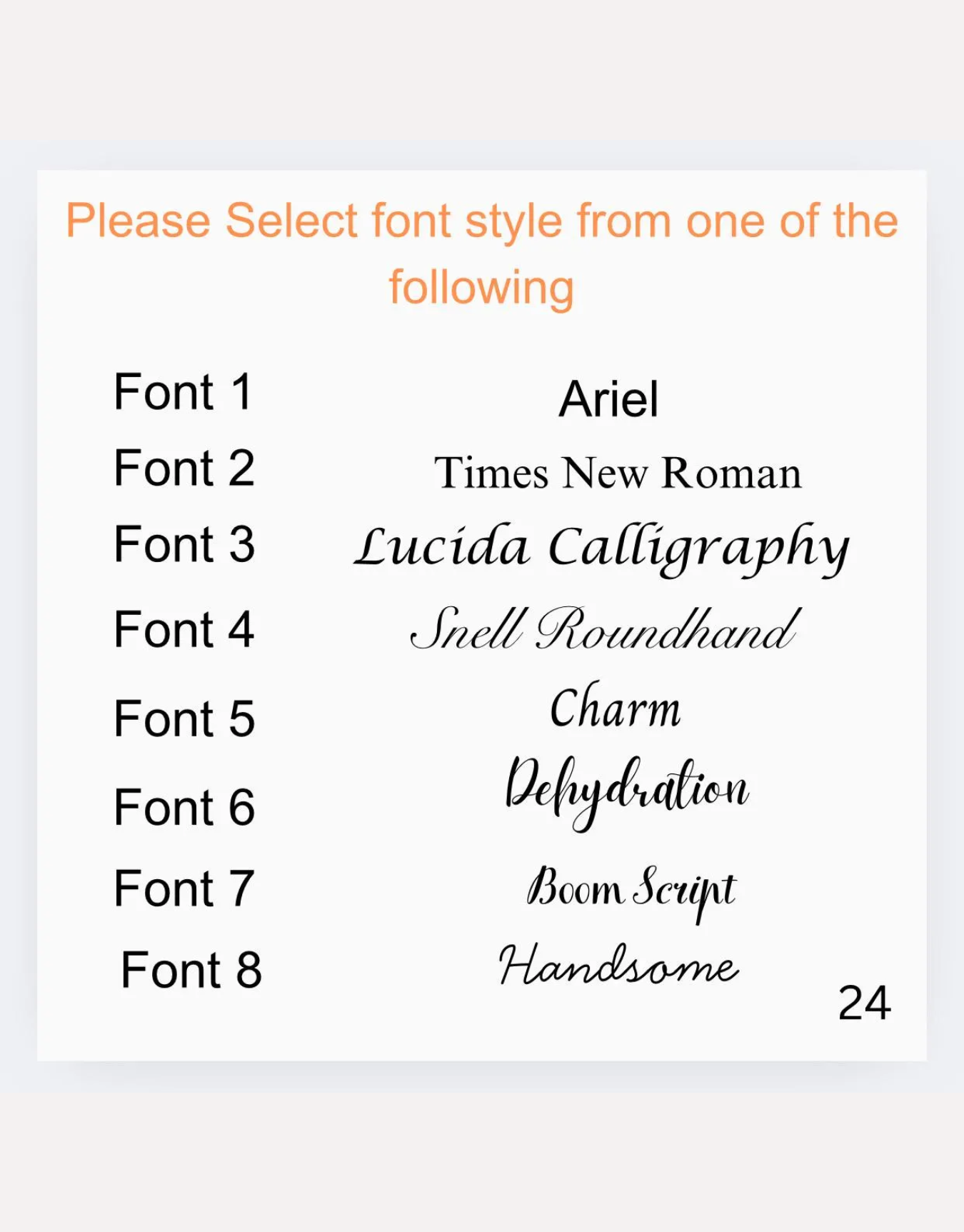 Each style has a corresponding font. If you want to choose a certain style but don't like the font, you can choose one of the 8 fonts we have selected or provide in the product photo.